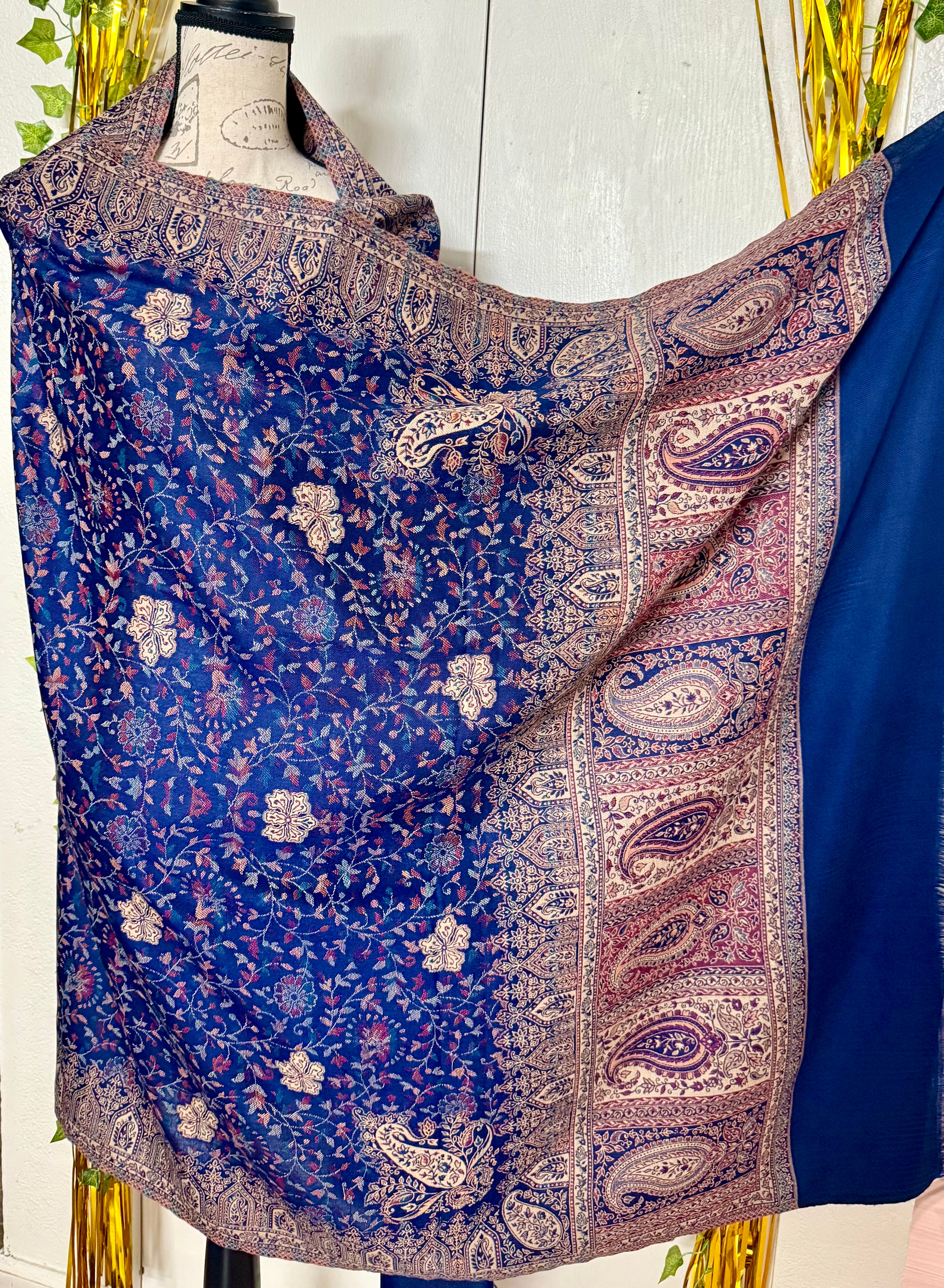 Wrap yourself in timeless elegance with this luxurious Kashmiri Pashmina Kani shawl. Crafted from the finest pashmina wool, this deep royal blue shawl features intricate all-over floral and paisley patterns in soft hues of gold, maroon, and beige, woven using the traditional Kani technique. The ornate border and classic Mughal-inspired motifs showcase the rich heritage of Kashmiri craftsmanship. Lightweight yet warm, this shawl is perfect for both festive occasions and sophisticated winter wear, adding a regal charm to any ensemble.