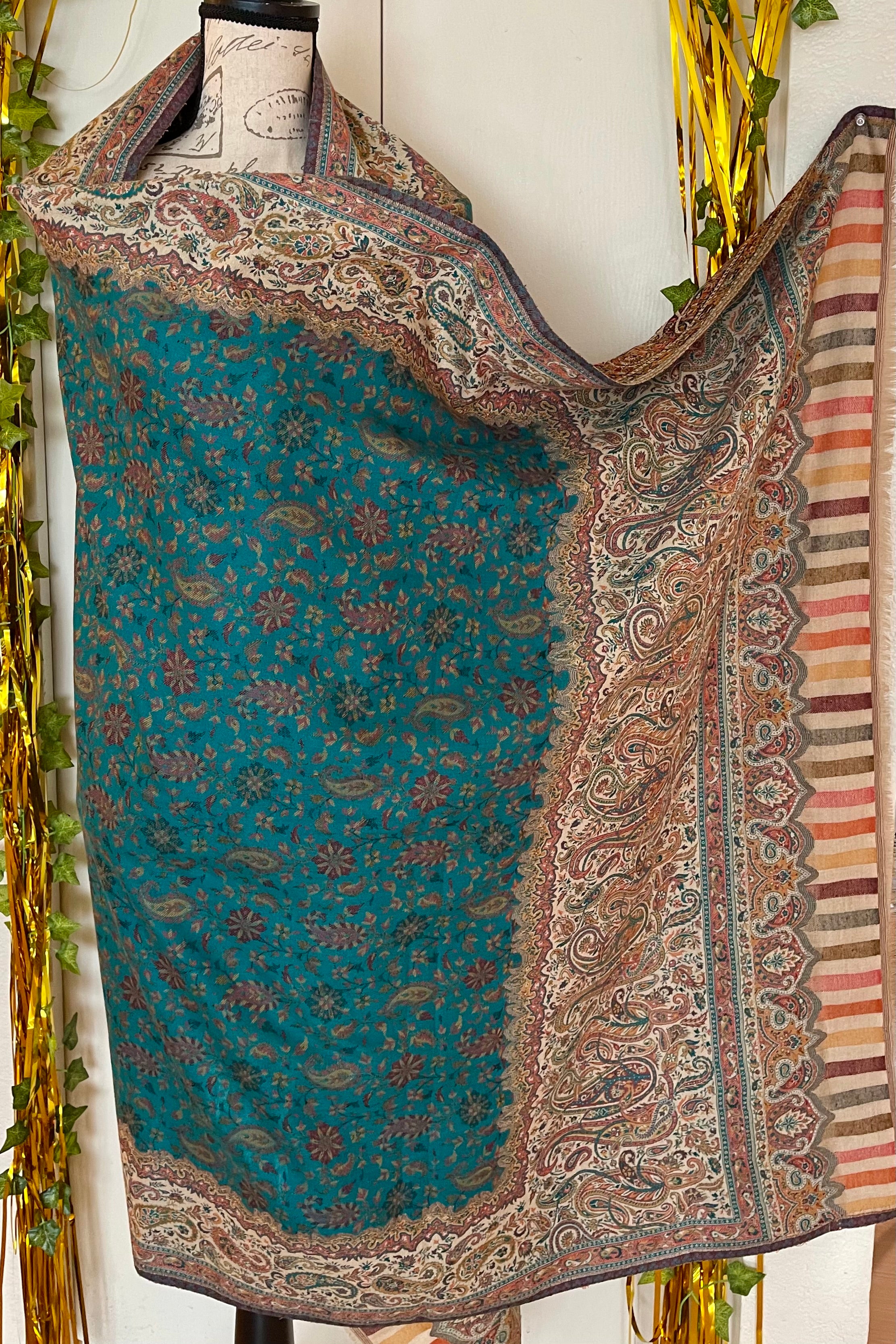 Wrap yourself in timeless tradition with this beautifully woven Kani wool shawl. Featuring a rich teal base adorned with classic paisley and floral motifs, this piece reflects the intricate artistry of Kashmiri craftsmanship. The shawl is bordered with a detailed multi-color paisley pattern and traditional stripe pallu, adding a vibrant yet sophisticated charm. Soft, warm, and lightweight, it’s a perfect accessory for both festive occasions and elegant winter styling.
