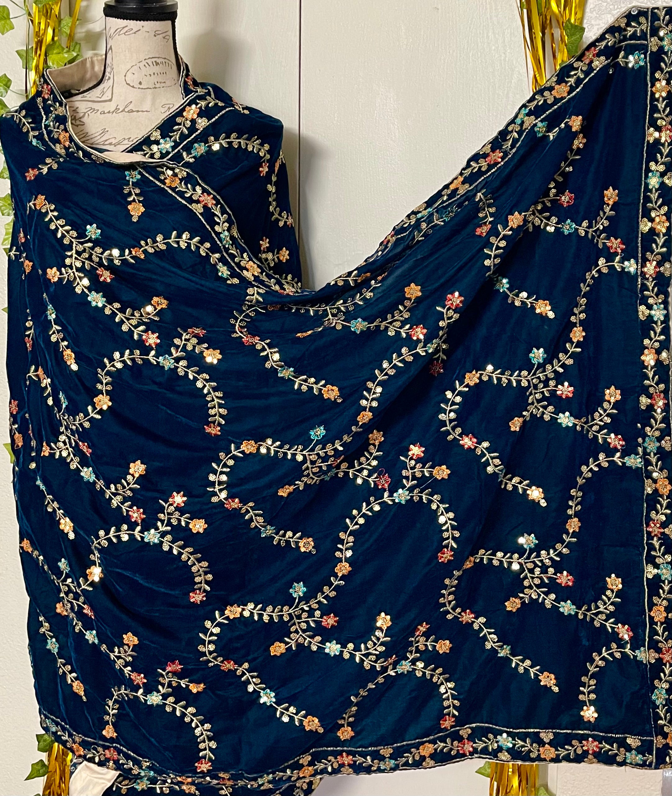 Elevate your festive look with this exquisite Pakistani shawl, beautifully crafted in a rich zinc blue velvet. Adorned with intricate multicolor floral embroidery in gold, rust, turquoise, and blush threads, the delicate vine patterns flow gracefully across the fabric, adding a timeless charm. The soft, plush velvet base enhances the richness of the embroidery, while the embroidered borders add a refined finishing touch. Ideal for weddings, formal gatherings, or festive occasions, this shawl blends traditional artistry with luxurious style.