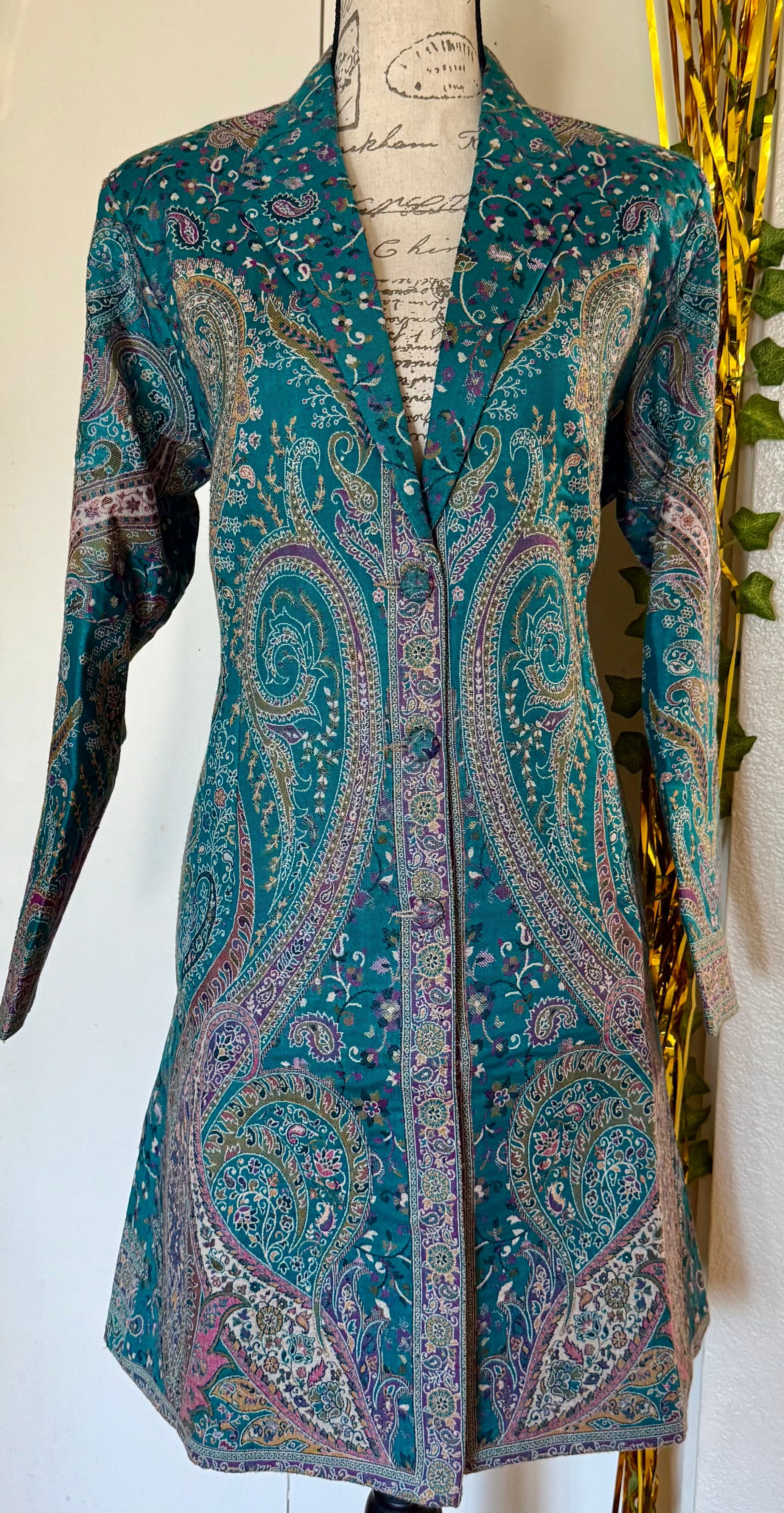 “Elegant single-piece Kani Pashmina coat in a rich teal base, adorned with intricate multicolor paisley and floral motifs inspired by traditional Kashmiri artistry. Crafted from fine pashmina wool, it features a tailored silhouette with front button closure, long sleeves, and a sophisticated lapel collar—perfect for adding a touch of heritage charm to any outfit.”