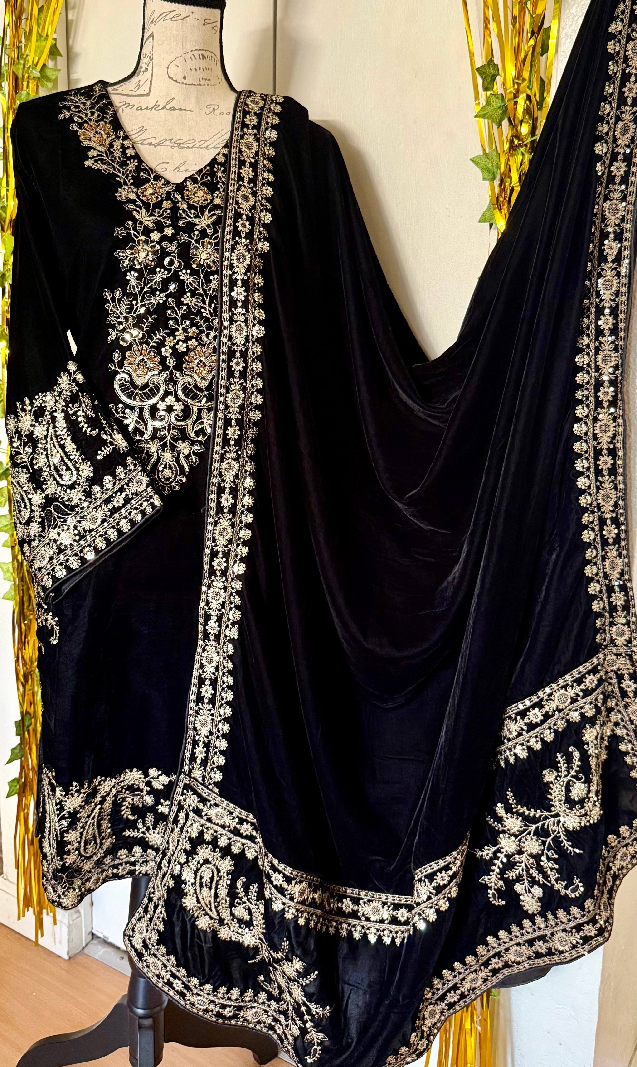 Elegant 3-piece black velvet suit with a velvet shirt, velvet trousers, and matching velvet shawl. Designed with the same gold zari and thread embroidery and embellished with beads for a subtle shine. Perfect for winter weddings and festive events.