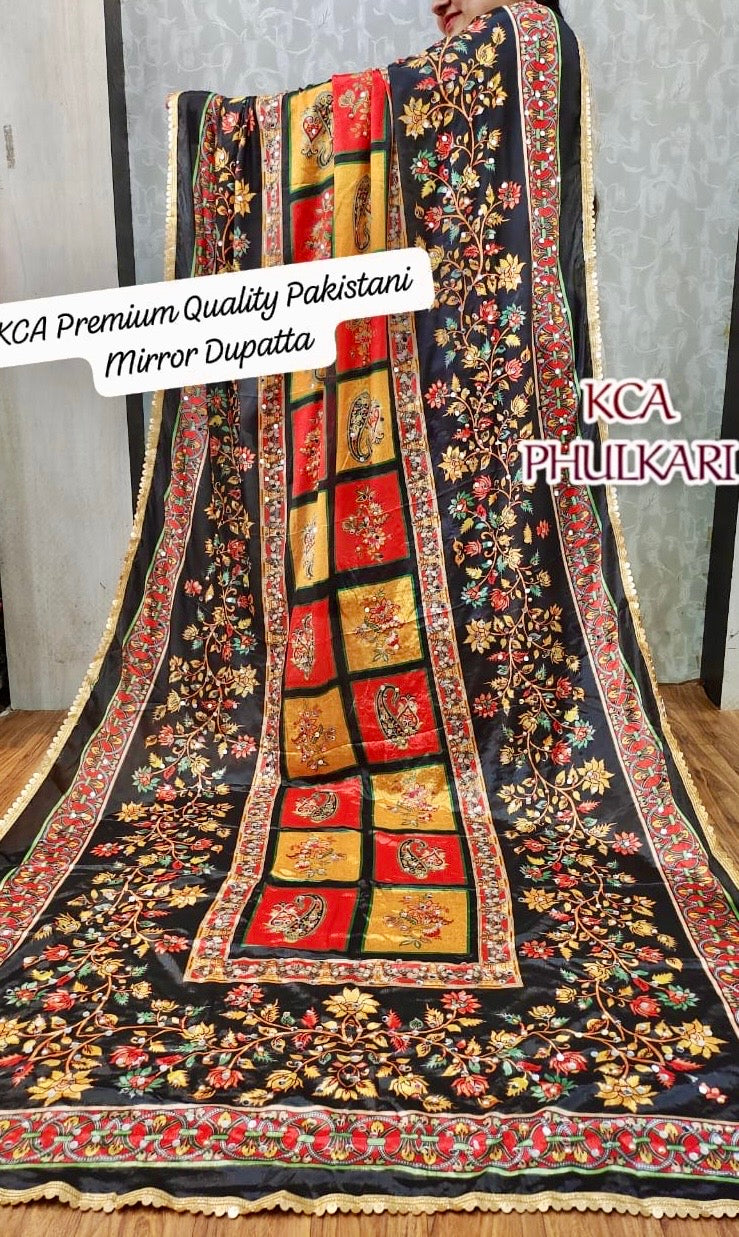 *🌹Beautiful Chinnon fabric Pakistani mirror dupatta with lace border length 3 yards and width 1.25 approximately. Fabric chinnon silk.Base color is black.
