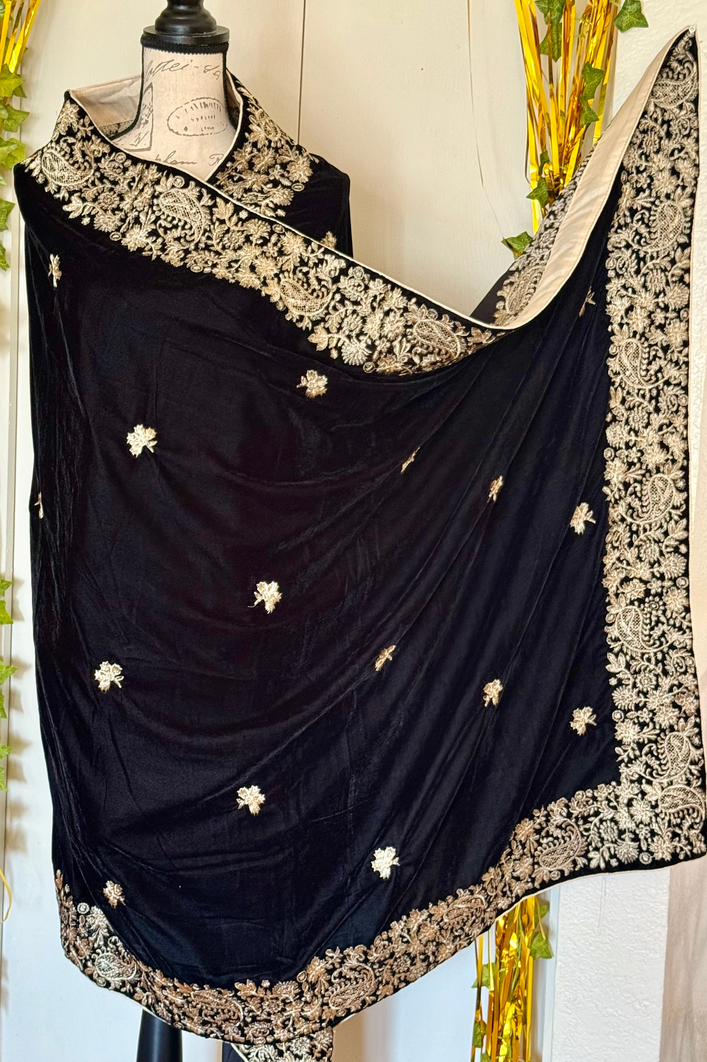 Add a touch of timeless grace to your winter wardrobe with this luxurious black velvet shawl. Crafted from premium velvet, it features intricate zari thread embroidery along the borders and scattered floral motifs throughout the fabric. The fine golden embroidery gives it a regal charm — perfect for festive occasions, weddings, or evening gatherings.