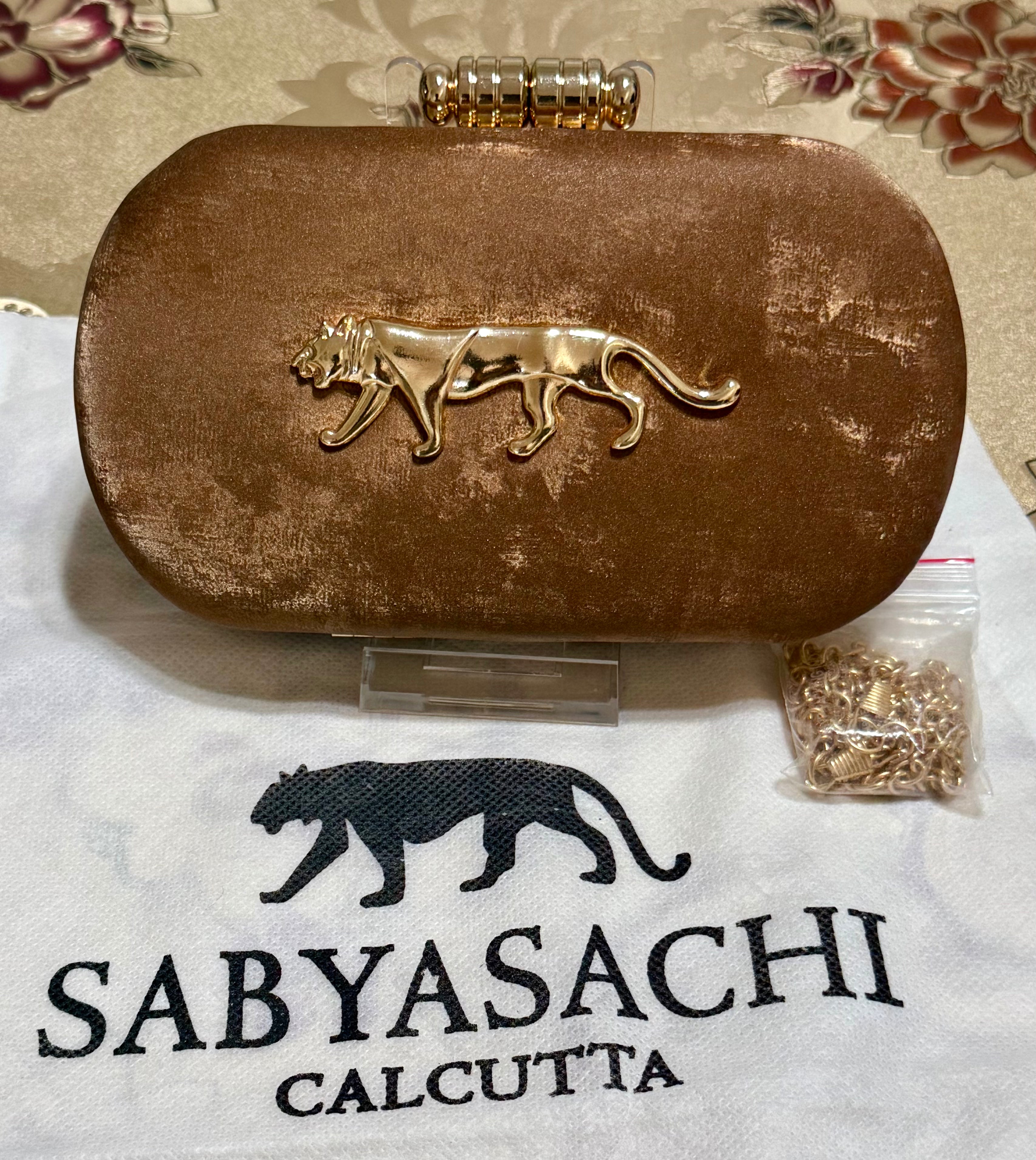 Add a touch of elegance to your outfit with this beautiful suede leather clutch. Designed in a rich brown shade, this box-style bag features a striking gold-tone panther emblem on the front and a secure metal clasp closure. It comes with a detachable chain strap, so you can carry it...